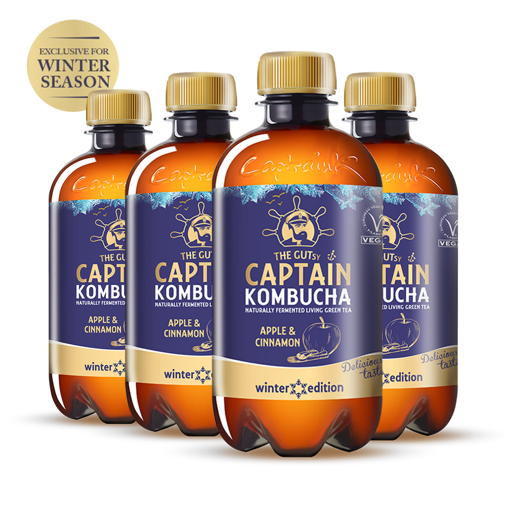 - Este pack contém 4 garrafas de 400mL da edição limitada de Inverno da GUTsy Captain Kombucha Maçã e Canela.